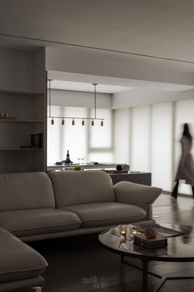 我們花了整個上午等待最佳光線。十點半的斜射光會溫柔地爬過白色大理石餐桌,在桌腳折射出晶瑩光點;午後兩點,落地窗的電動窗簾,讓柔和的陽光灑落整個客廳。暖白的天色讓深色電視牆呈現出濕潤的石材本色,反而襯得白色沙發格外溫暖。
