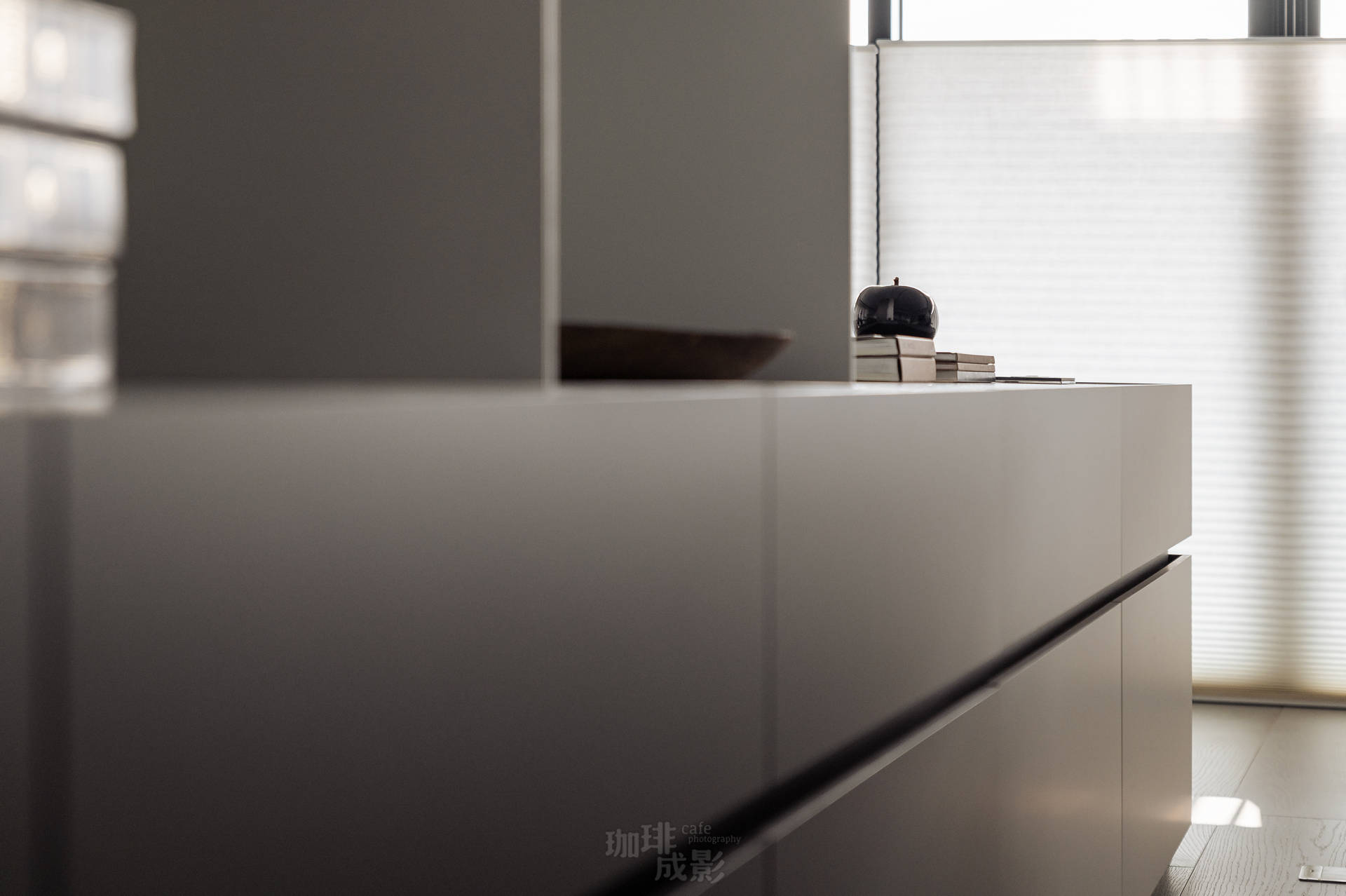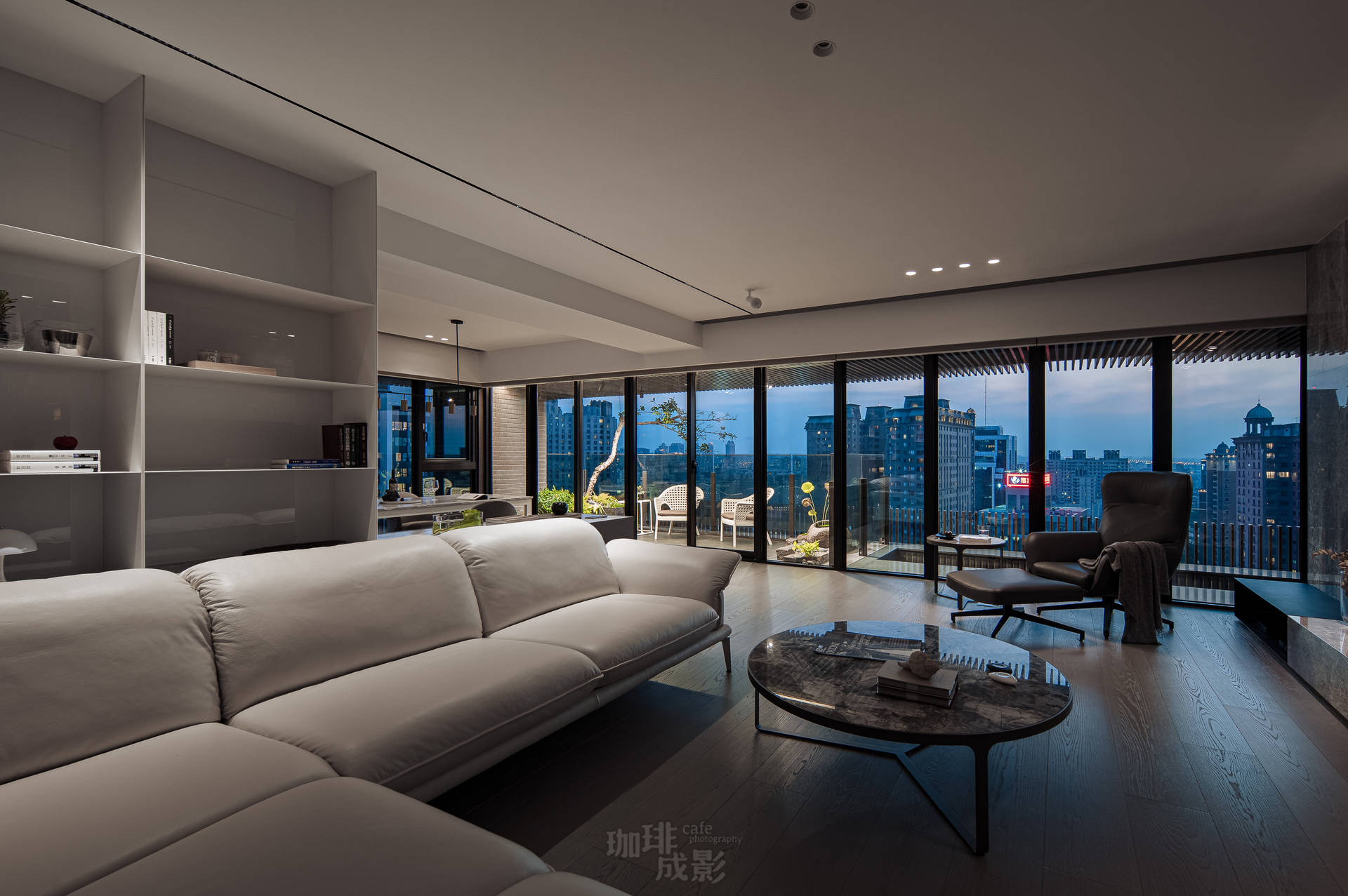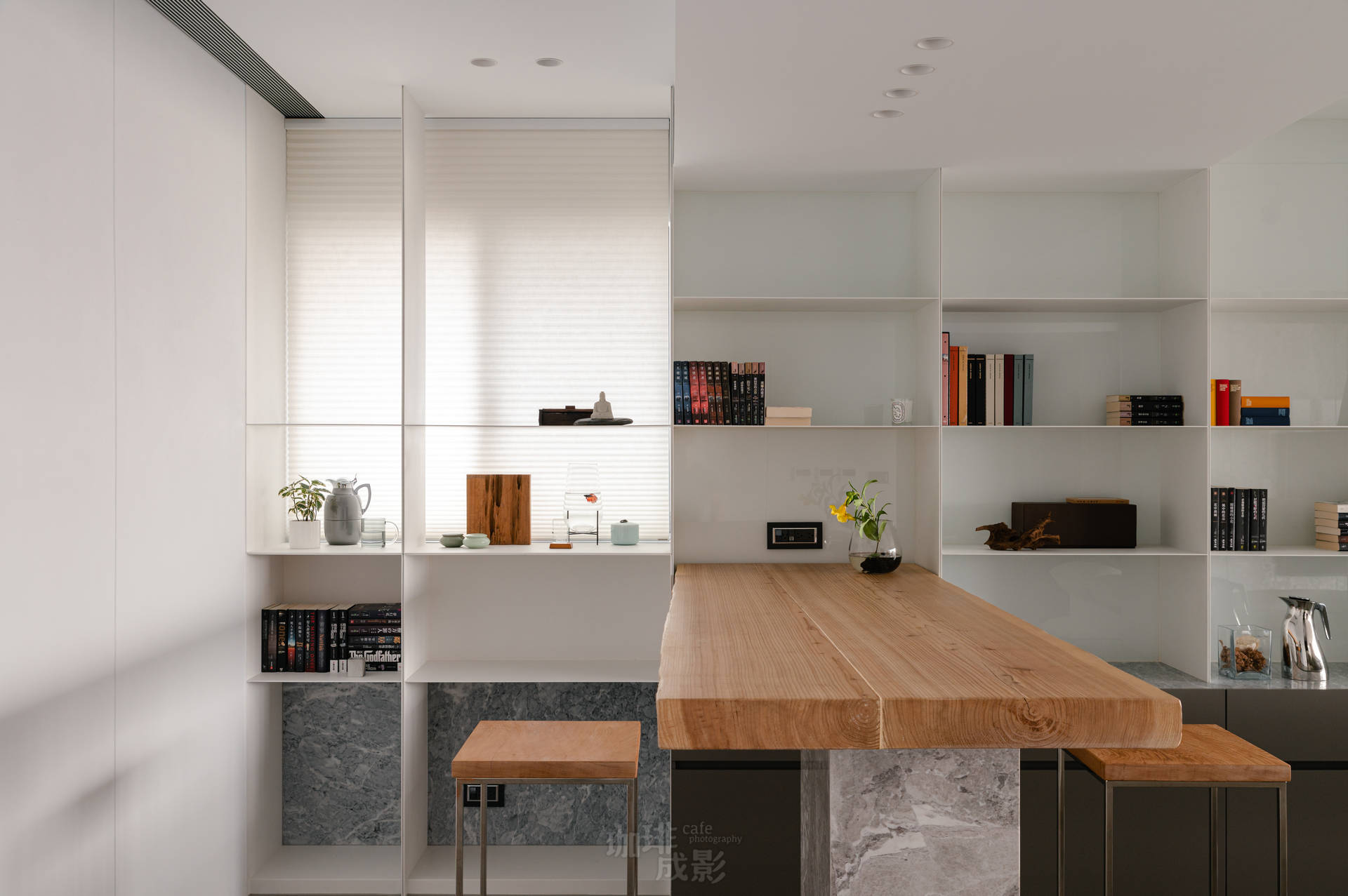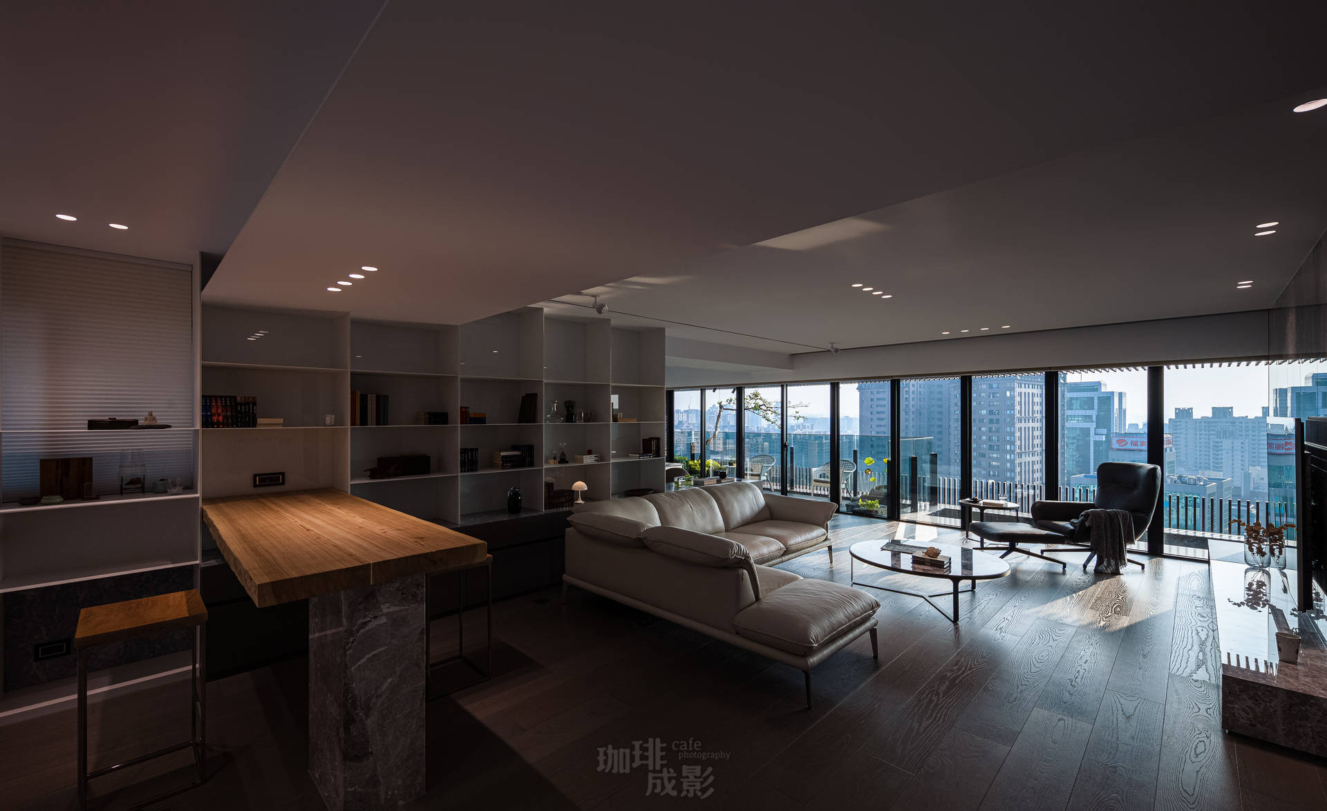 書櫃前的吧檯是空間的驚喜。當暮色浸染窗景,我們只點天花板的小崁燈,光暈恰好能同時照亮後方書櫃的皮革書背與前方的大理石檯面,彷彿為日夜交替舉行一場小型儀式。