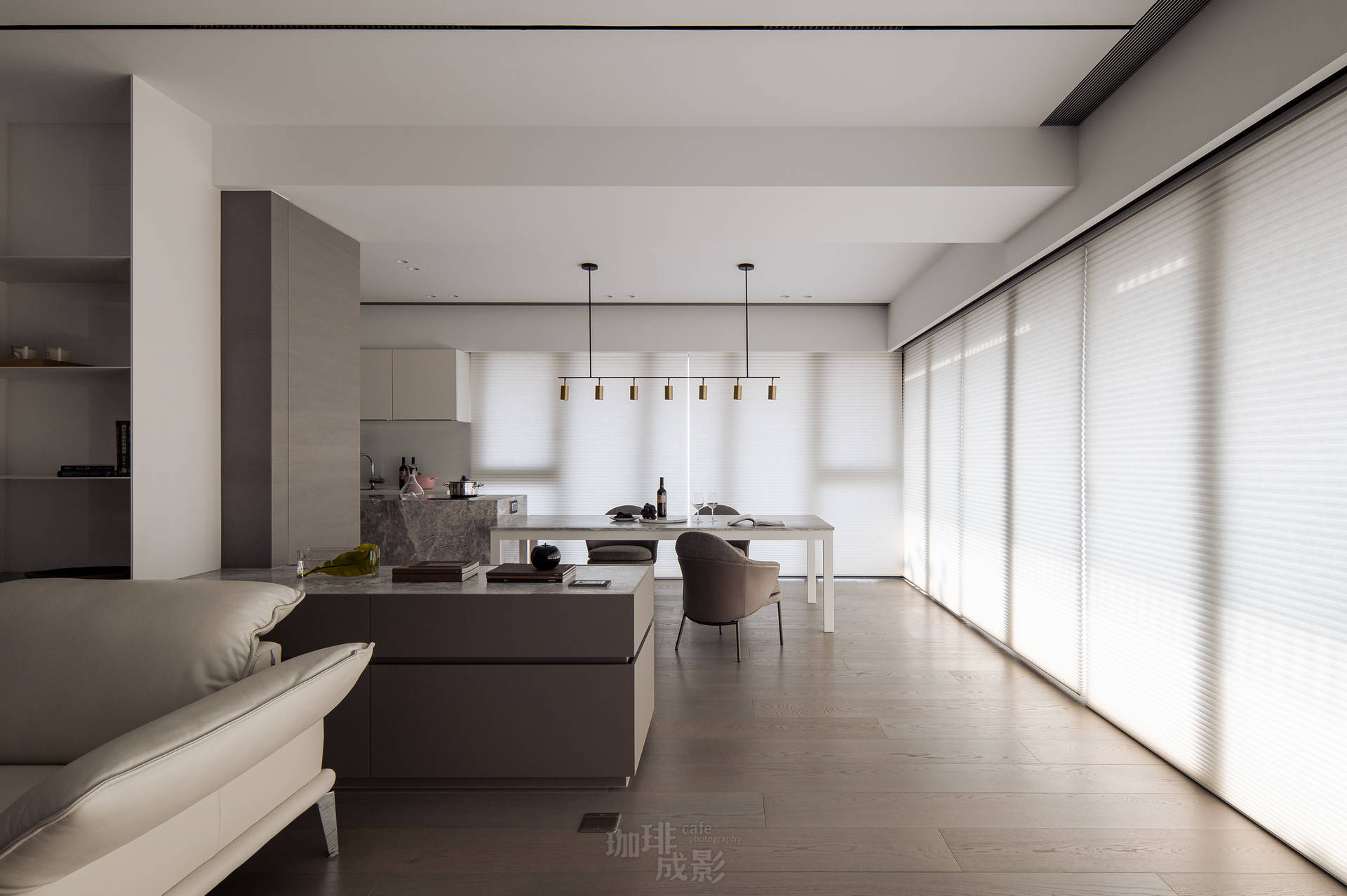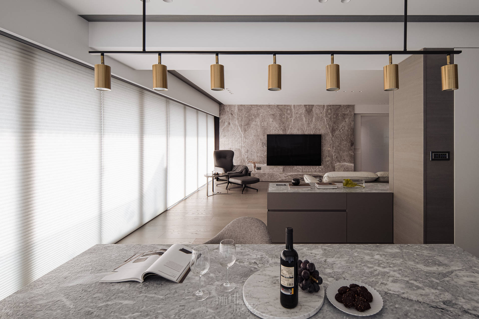 我們花了整個上午等待最佳光線。十點半的斜射光會溫柔地爬過白色大理石餐桌,在桌腳折射出晶瑩光點;午後兩點,落地窗的電動窗簾,讓柔和的陽光灑落整個客廳。暖白的天色讓深色電視牆呈現出濕潤的石材本色,反而襯得白色沙發格外溫暖。