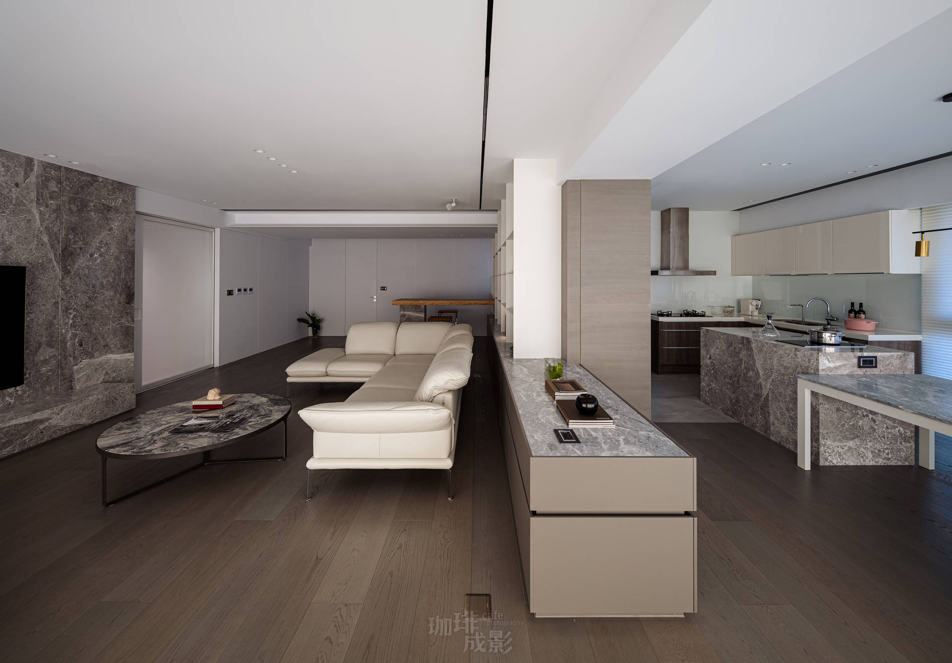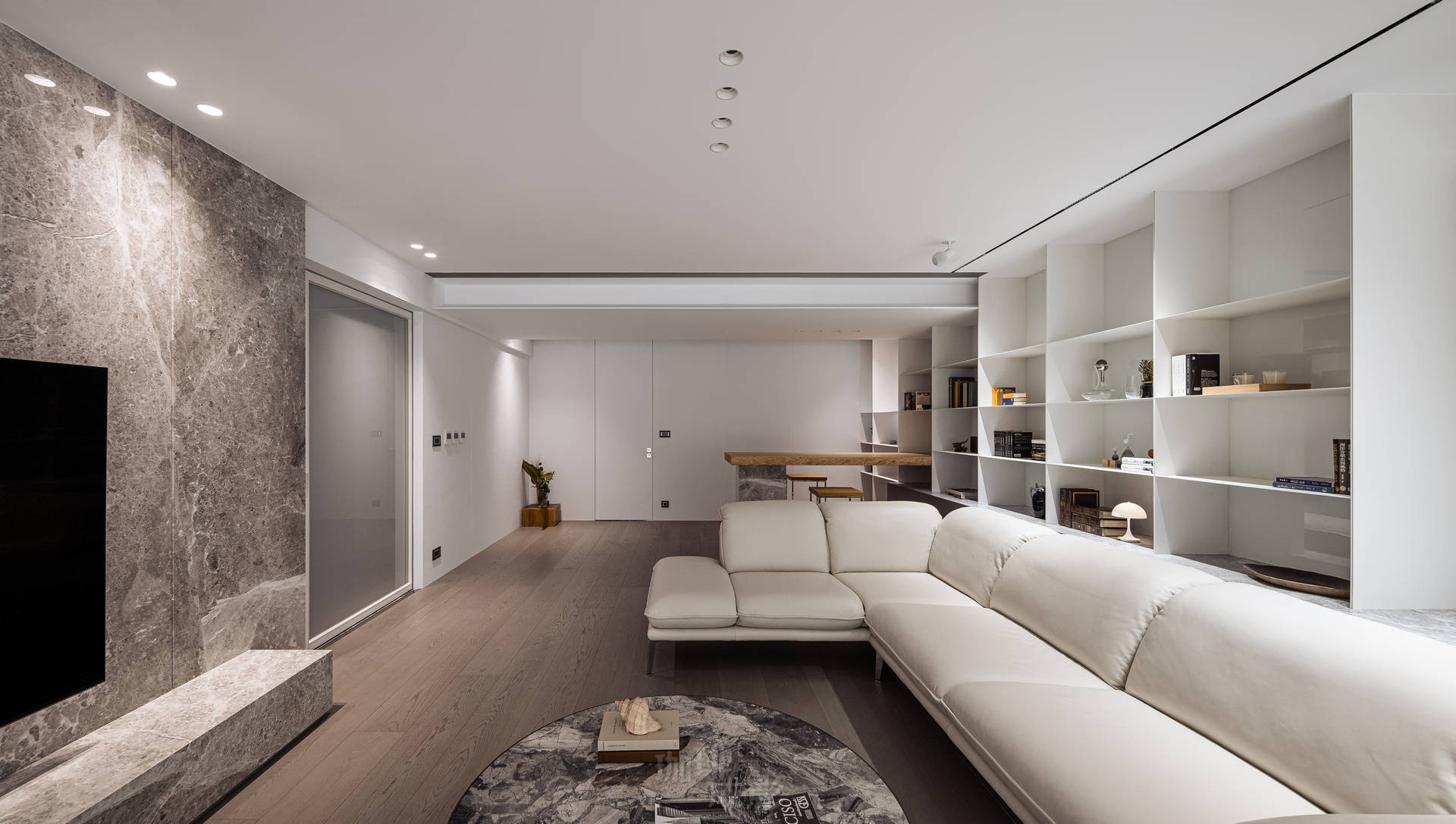 推開厚重的大門,深色大理石牆以山水紋理率先鎮住場面。光線在此轉折,越過玄關,整座白色客廳在落地窗前展開,像突然掀開的珍珠寶盒。