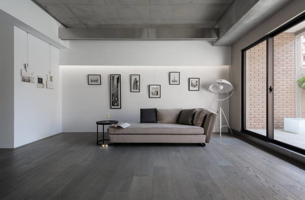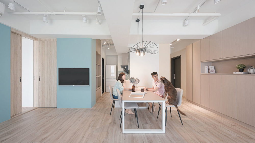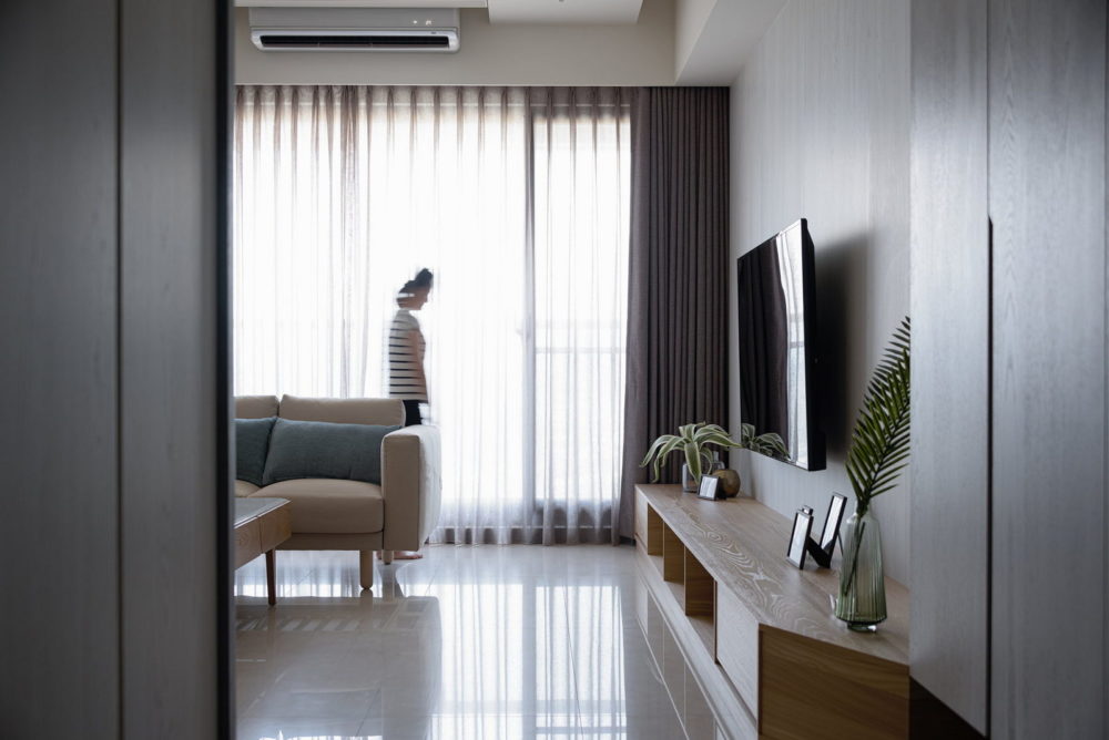 這次所拍攝的空間坪數並不大,是一個只有兩房的小公寓,而且客餐廳空間也略顯狹長。所以拍攝這類空間,機位就顯得特別重要了,如何利用透視感來放大整體的空間感。雖然只要透過廣角鏡頭就可以拍出誇張的透視感,但過於變形與不自然的透視感,也會影響作品的呈現。所以比例拿捏得當,才是空間攝影師在尋求拍攝點時,所要特別留意的地方。