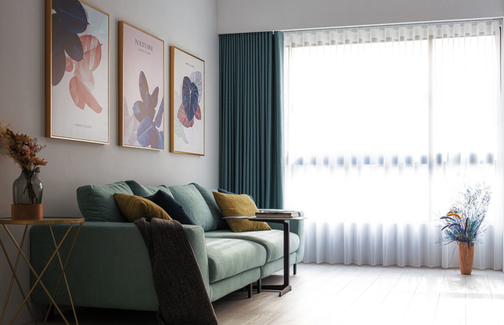 在客廳的拍攝中,刻意採近距離的取景方式,稍微誇張的放大透視角度,並且為了消弭不自然的透視感,採用低位距離來拍攝,這樣可以讓靠近地面的透視線條不會太過張揚。如此所拍攝好的作品,雖然現場是小型空間,但透過良好的取景,一樣可以呈現出寬敞的居家空間。