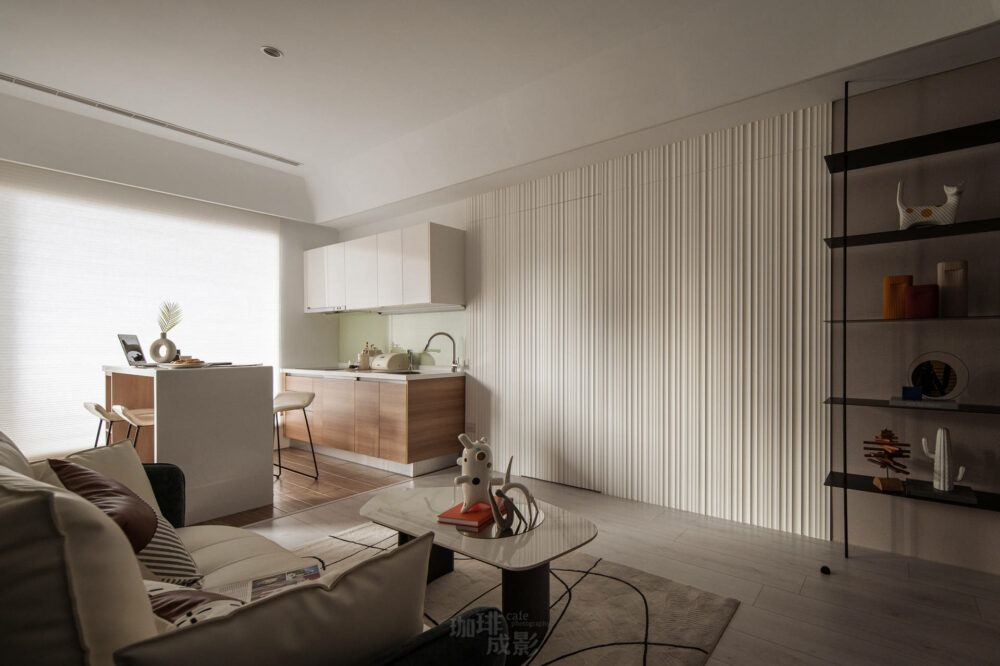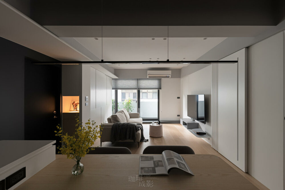 這場位於天母的舊屋翻新案,拍攝時刻意強調其內部空間黑白對比的牆面配色,簡單明了的線條令人印象深刻。沙發配上白色的電視牆,形成了一個舒適又現代的休閒空間。客廳內的小茶几提供了一個完美的放鬆場所,讓屋主在閑暇時欣賞電影或者享受一杯茶。餐桌搭配了木質餐椅,廚具以深色呈現,增加了室內的現代感。