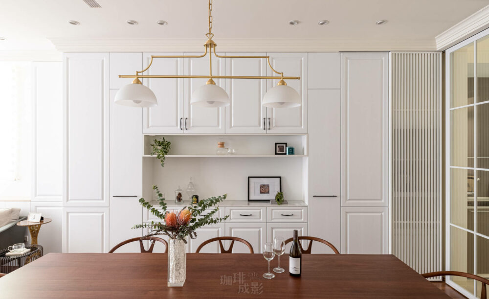 圓形餐桌吊燈是空間的靈魂。陰天時,它像一輪明月懸浮在空中,在木質桌面上投下溫柔的光暈。我們刻意在桌上擺放一個花瓶、一個茶壺、幾本書,讓投射的陰影成為最自然的裝飾畫。