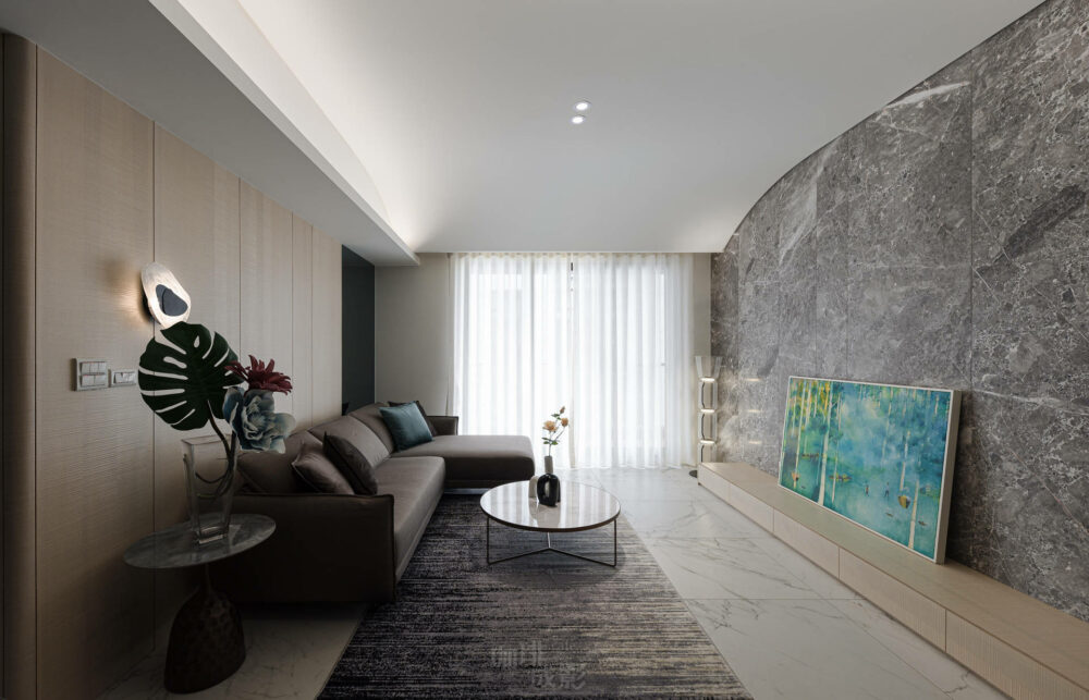 推開門的瞬間,就被那道斜射進客廳的陽光吸引。深褐色的大理石牆面像塊高級巧克力,在自然光下顯出細緻的紋理,意外地一點都不顯沉重。空間攝影師很聰明地捕捉了這個對比——沉穩的色調裡,陽光成了最活潑的住客。