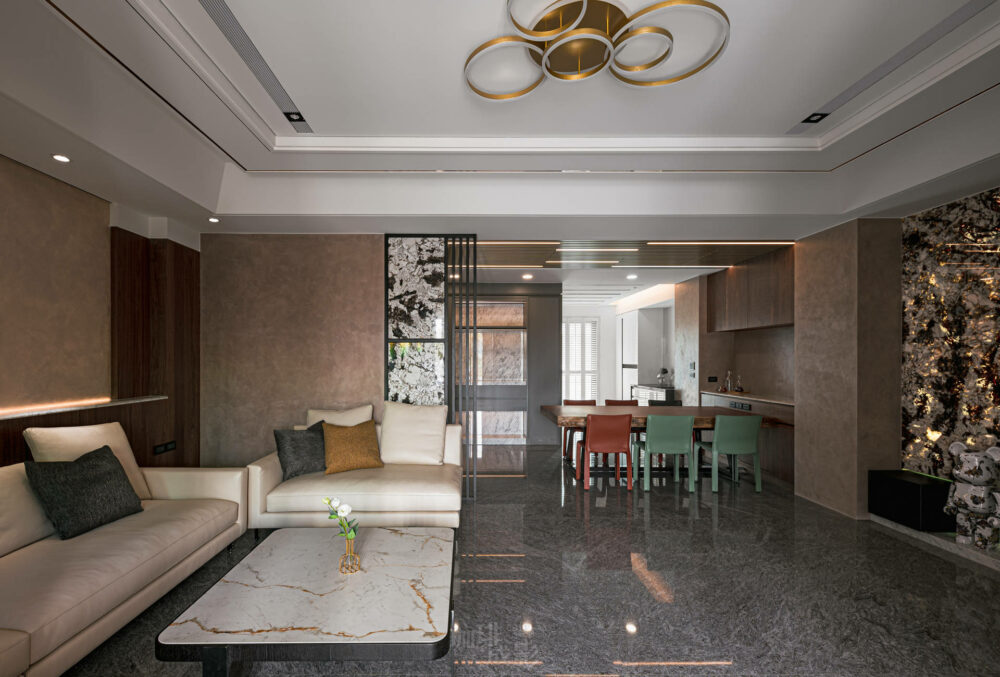 金屬展示櫃也是這個家的華麗配角,黃銅色光澤低調地閃爍著,櫃子裡收藏的物件在鏡頭下變成一個個小驚喜。從餐廳望向客廳的角度特別迷人,大理石地板反射著窗光,讓深色沙發區也明亮起來。