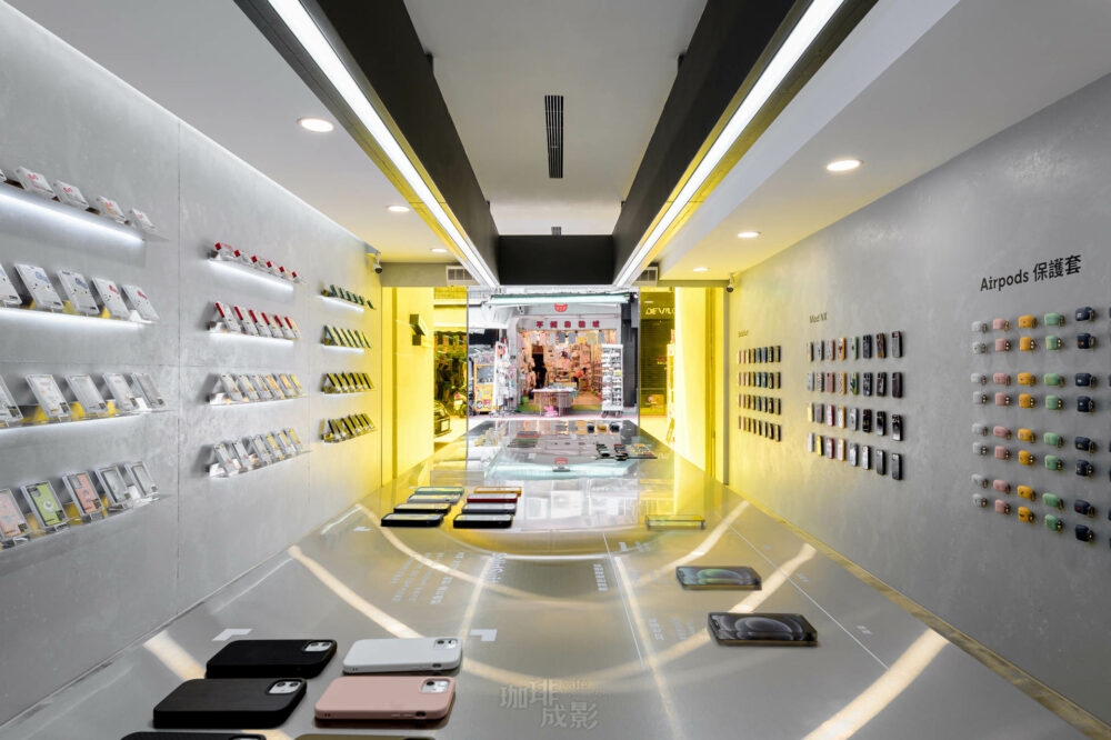 台中「犀牛盾門市」是由愛進化科技於2021年設立的專賣店,展示品牌對創新與品質的追求。 室內設計以現代簡約風格為主,使用淺色木質材料,營造出溫馨且專業的氛圍。牆面採用白色與品牌標誌性的黃色,增添視覺張力。中島型展示檯的設計,方便顧客近距離體驗產品,提升互動性。