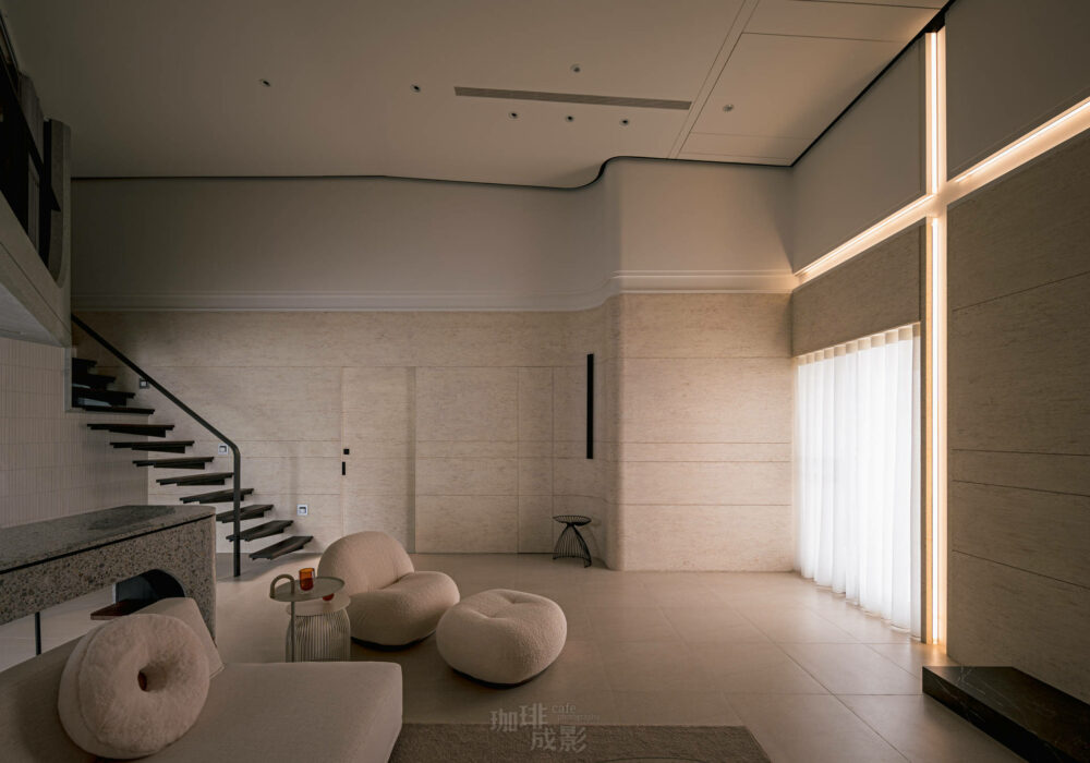 攝影師巧妙地將人物融入畫面,為靜謐的場景注入生活氣息。在客廳的取景中,透過植栽點綴,石材的冷峻與植物的生機形成鮮明對比,展現空間的和諧共生。